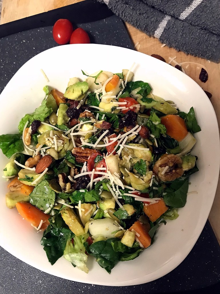 Romaine ; spinach; roasted zucchini & tomato 🍅; cilantro, green onions; pear; sweet potato 🍠; basil 🌿; avocado 🥑; cucumber 🥒; nuts 🥜, cranberry; vegan Parmesan cheese.