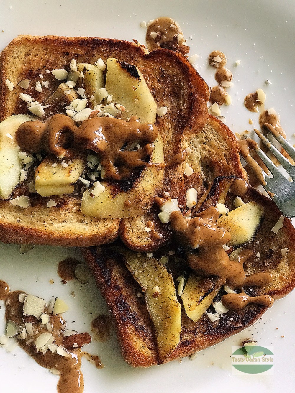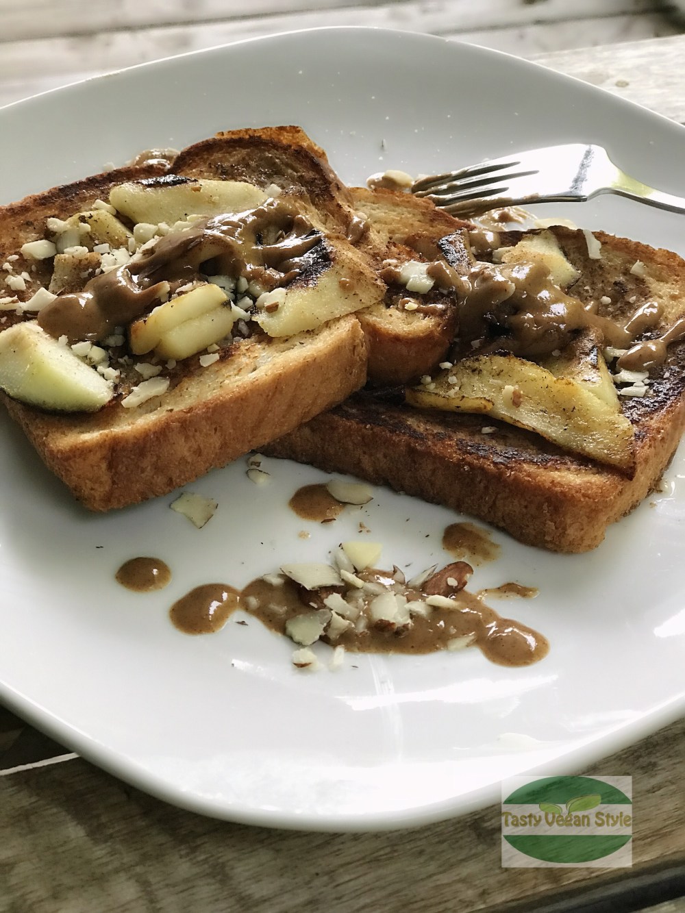 This French Toast is accompaniment with fried apples 🍎, crushed almonds, almond butter and maple syrup drizzle. It is dairy-free and delicious 😋!