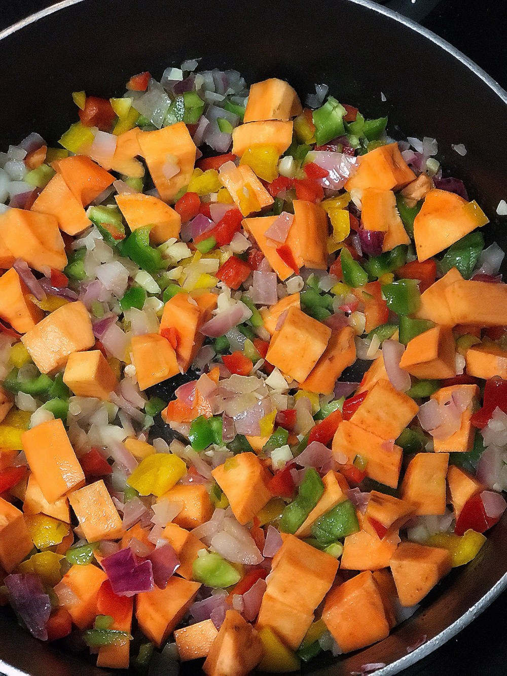 - Heat oil in dutch oven on medium-high heat. Add sweet potatoes 🍠 and onions, stirring often until onions are soften about 4 minutes.