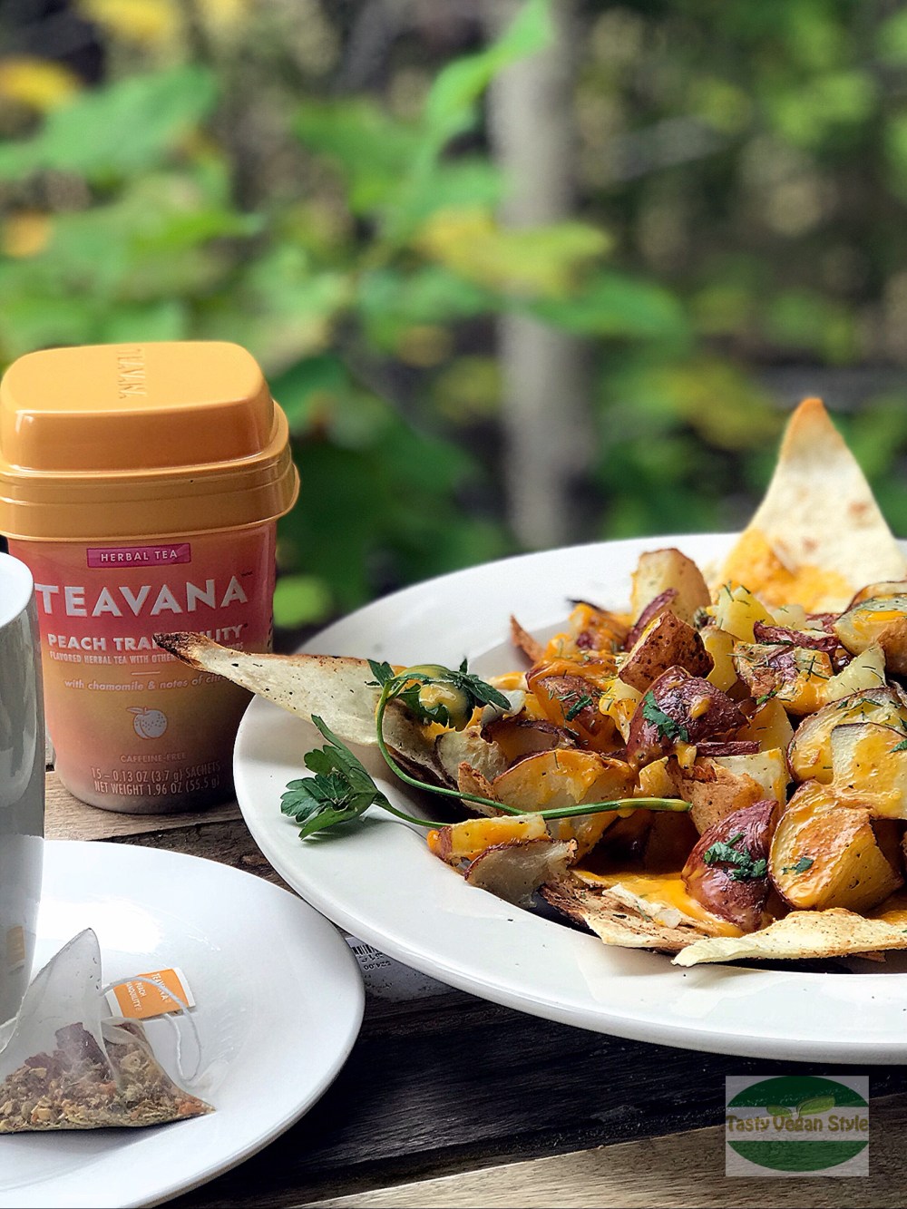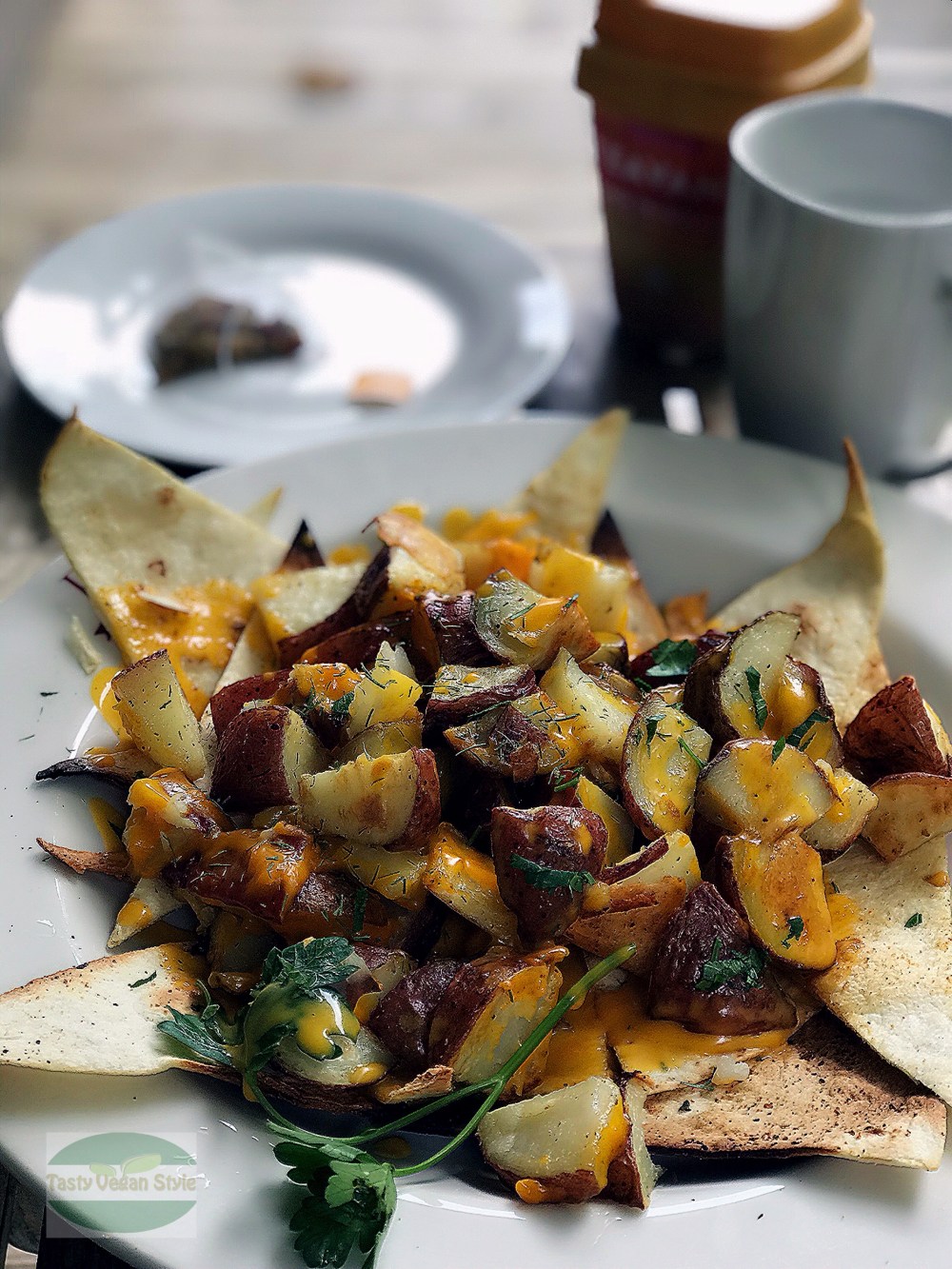 Melt cheddar cheese with cashew milk in small sauce pan. Drizzle over tortillas and potatoes. Add cut cilantro and dill to garnish. Serve immediately.