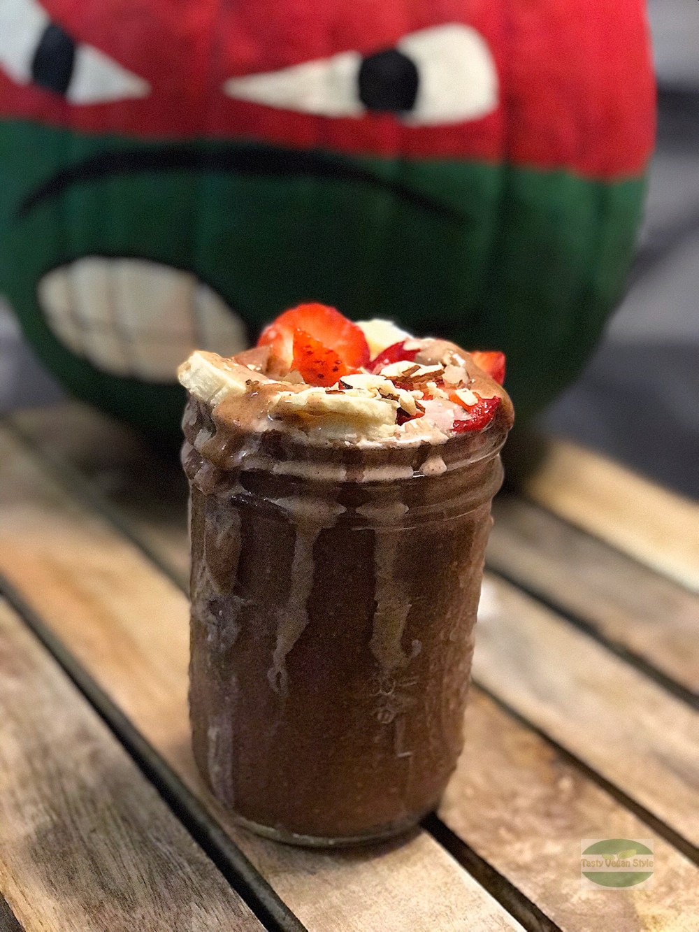 This smoothie has apples, bananas, strawberries 🍓, oatmeal, cashew milk cacao powder and ice cubes.