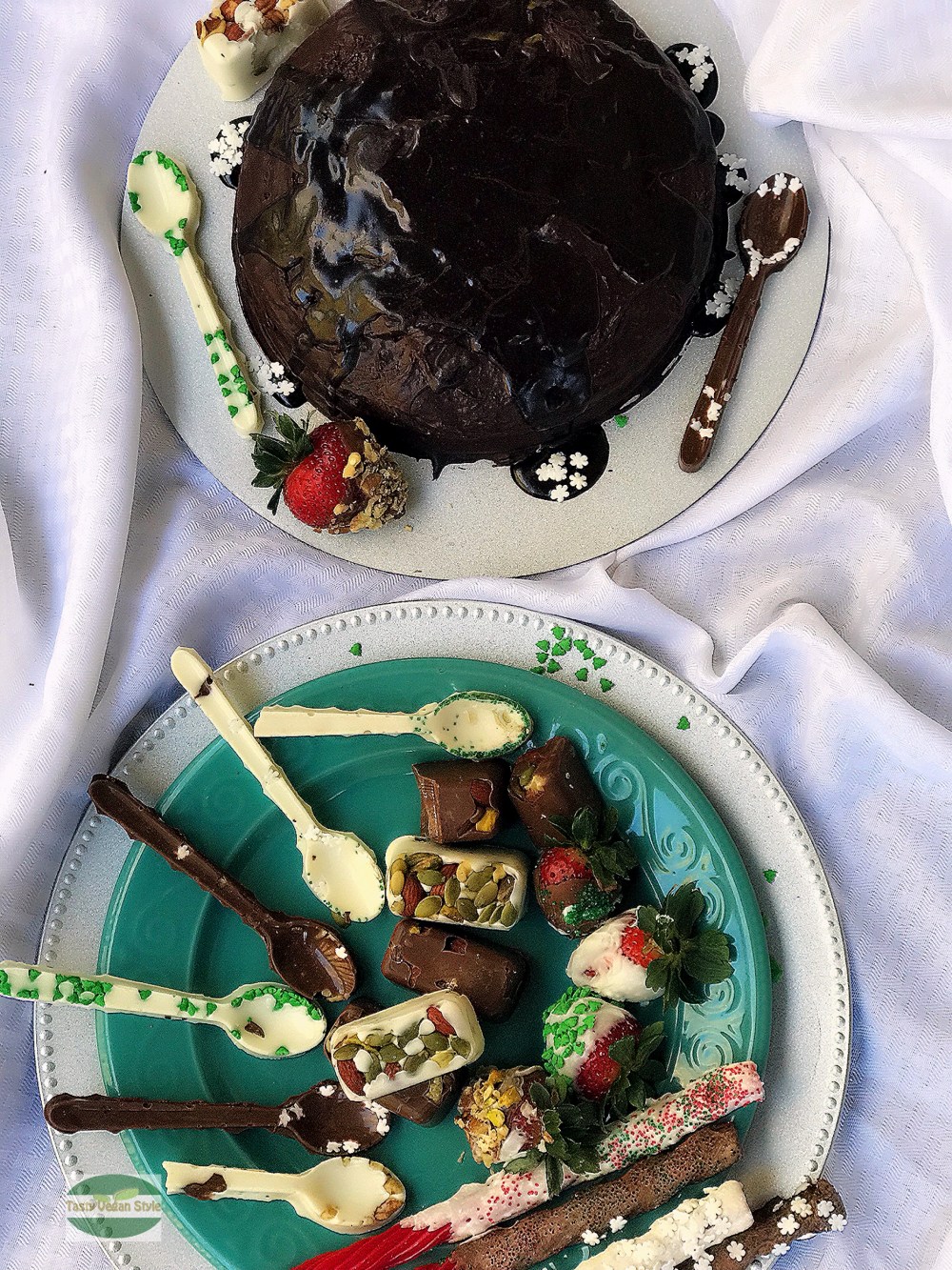 Here is the order I just delivered to a satisfied customer. These chocolate spoons are nutty and so good. The nut bars say eat me and the chocolate cake is vegan.